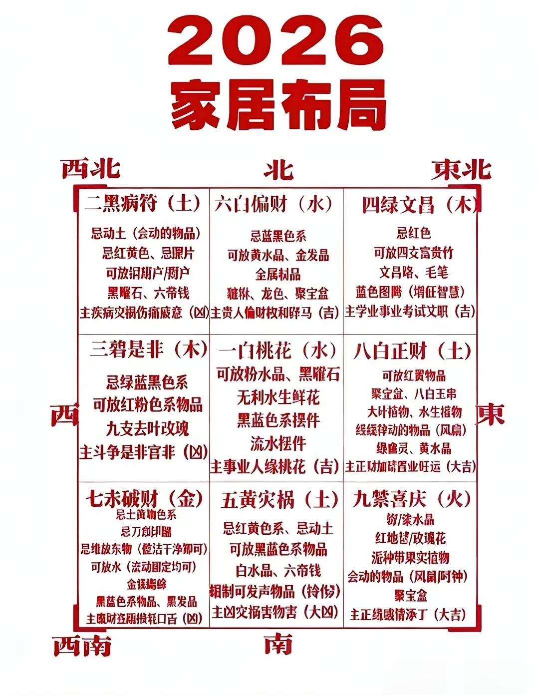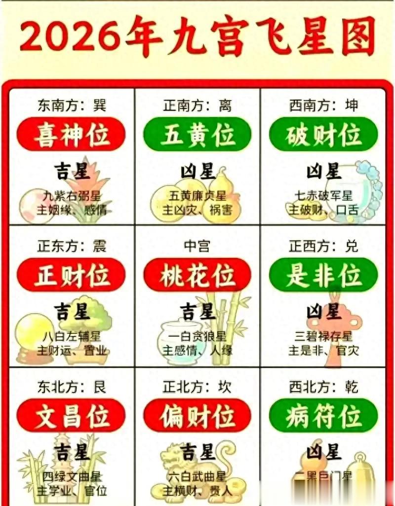 2026年九宫飞星以《洛书》九宫为基础,各方位对应卦象、星曜及文化寓意如下: