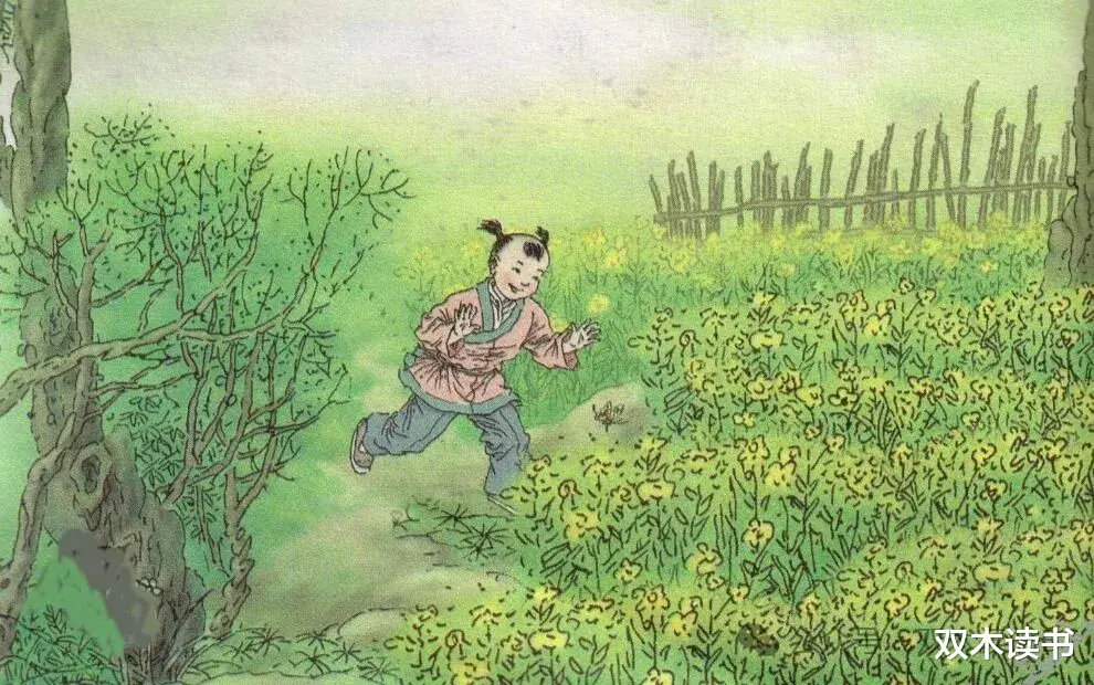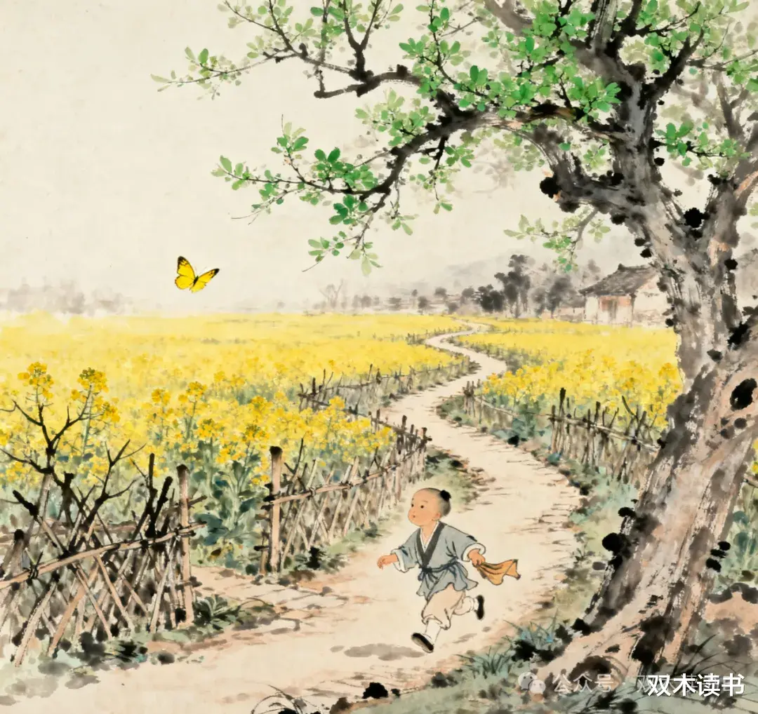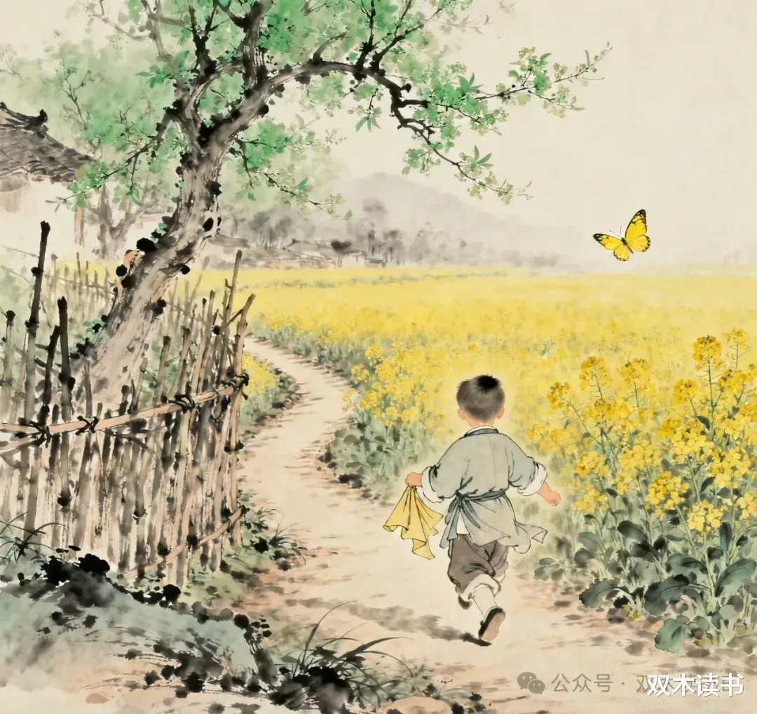 走着走着,突然听到 “咯咯” 的笑声,他抬头一看,不远处的菜花田里,一个穿着蓝布褂子的小孩正跑着,手里还晃着一根小树枝,追着一只黄色的蝴蝶。