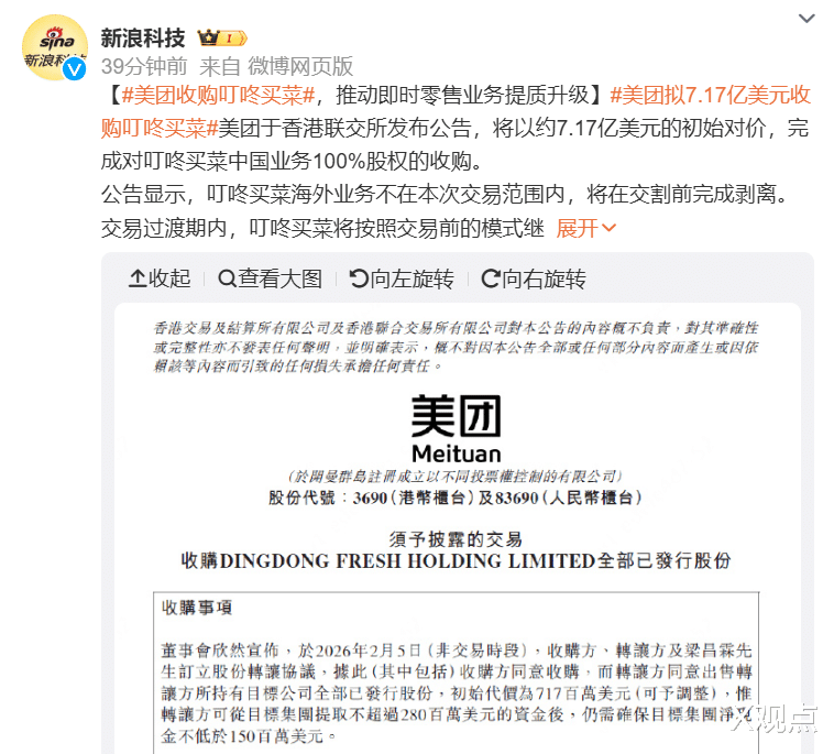 美团一纸公告,以7.17亿美元的价格,将叮咚买菜的中国业务收入囊中。没有漫长的传闻铺垫,没有暧昧的讨价还价,一切干脆得令人屏息。
