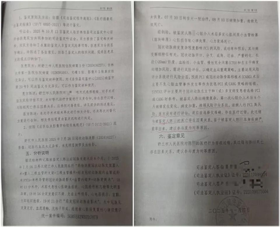 报告中称,2025年7月26日17时16分,在舒兰市人民医院再次行“药物洗脱冠状动脉支架置入术+置入三根血管的支架+三根血管操作+经皮冠状动脉腔内血管成形术PTCA+单根导管的冠状动脉造影术+血管内超声+动脉穿刺术”,18时13分术毕,术前无急性心肌缺血症状、心肌损伤标志物等无明显异常。术后18时54分突发意识不清、无自主呼吸等,心电图提示:室颤,立即组织抢救,19时21分行“经皮冠状动脉造影术”,术中诊断:冠脉正常。7月30日转吉大一院住院治疗,心肌损伤标记物肌钙蛋白等指标高,心脏功能仍不稳定。8月3日突发病情危重、室颤等,抢救无效死亡。