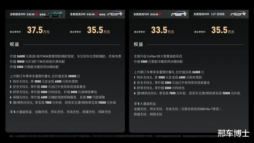 全新坦克500定位全场景智能豪华越野SUV,推出Hi4-Z、Hi4-T及3.0T V6燃油三种动力版本,其中Hi4-Z智享版37.5万元,Hi4-T智享版35.5万元,Hi4-T基础版33.5万元,3.0T造境版35.5万元,相比预售价格更具吸引力。
