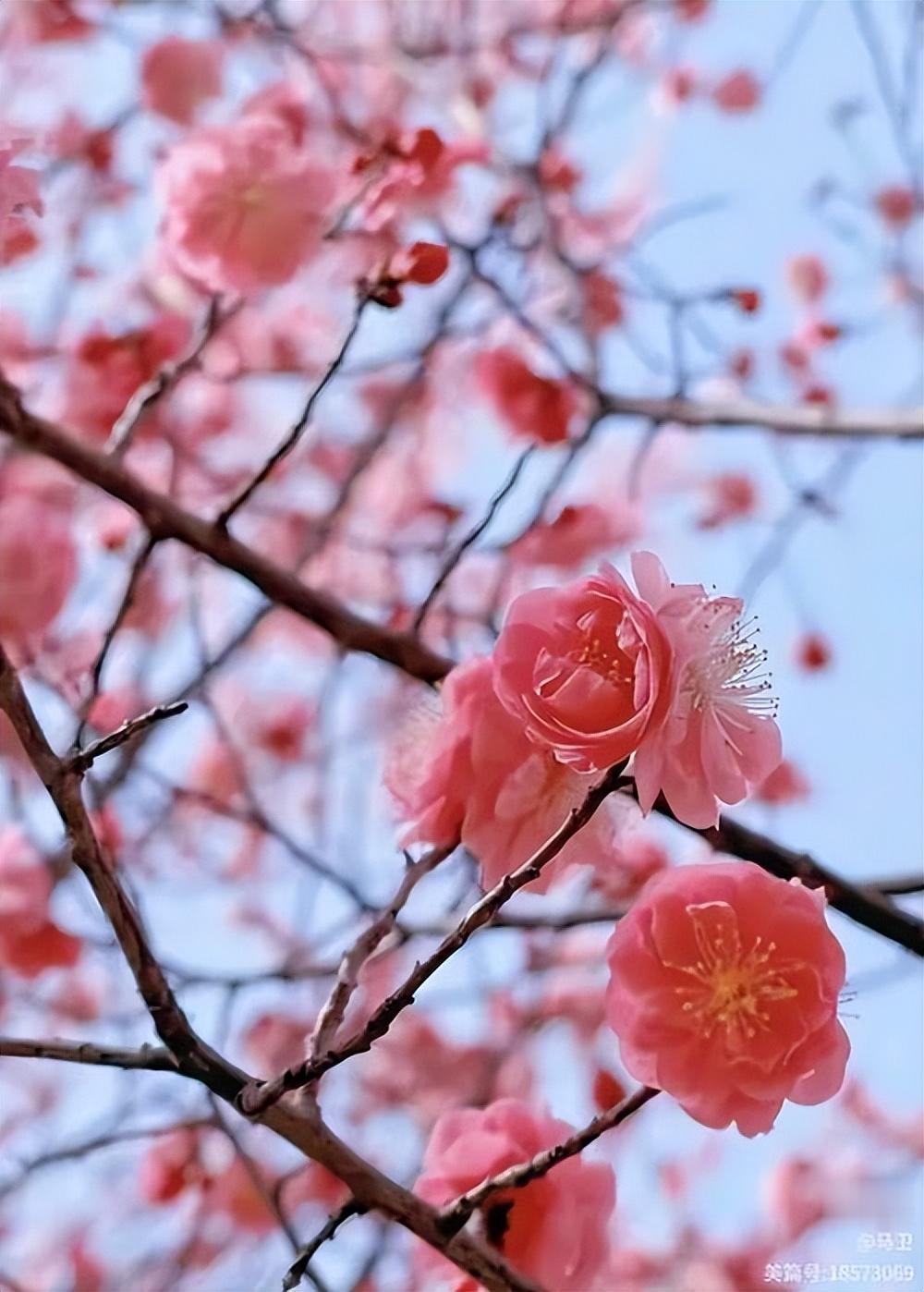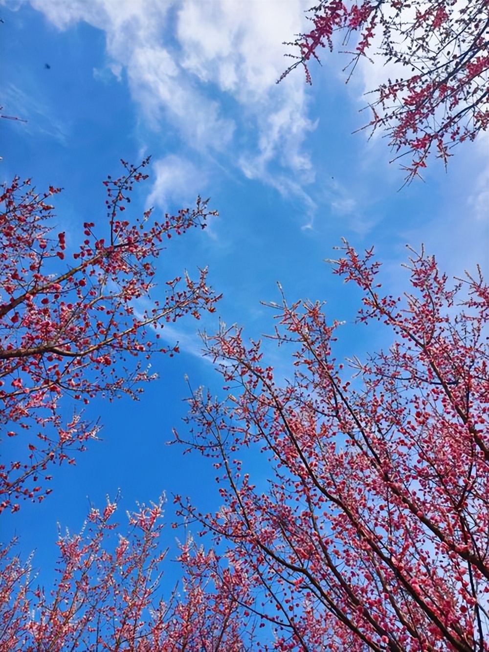 有的梅树枝条肆意伸展,伸手就能触碰那娇嫩的花瓣;有的繁花簇拥,密不透风,站在树下抬头,只见花不见天,满是国风雅致。