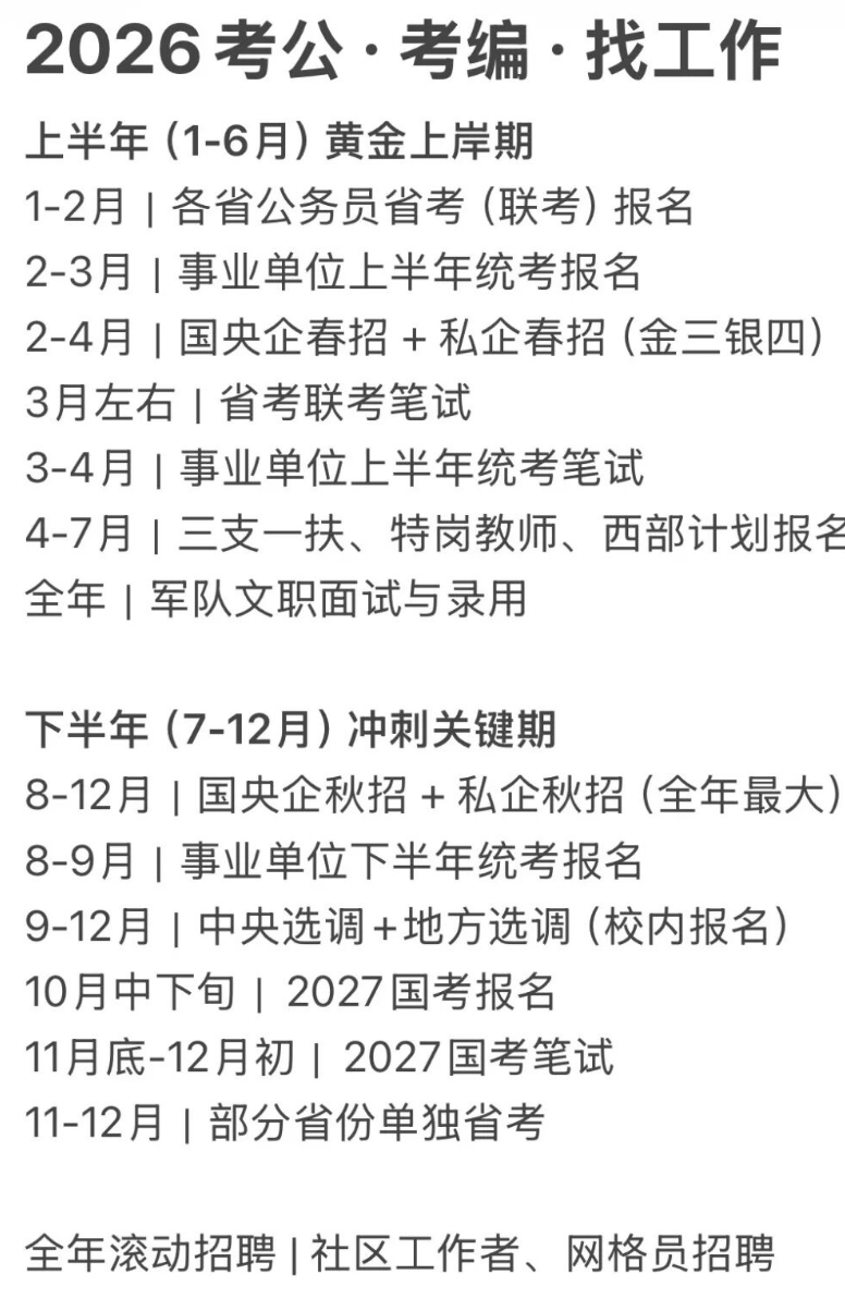 很多同学不是能力不够,而是错过报名、踩错时间,白白浪费了应届生身份。不管你目标是公务员省考、事业单位统考、国央企招聘,还是私企春秋招,这条时间线都能帮你提前规划、不错过任何一次机会。