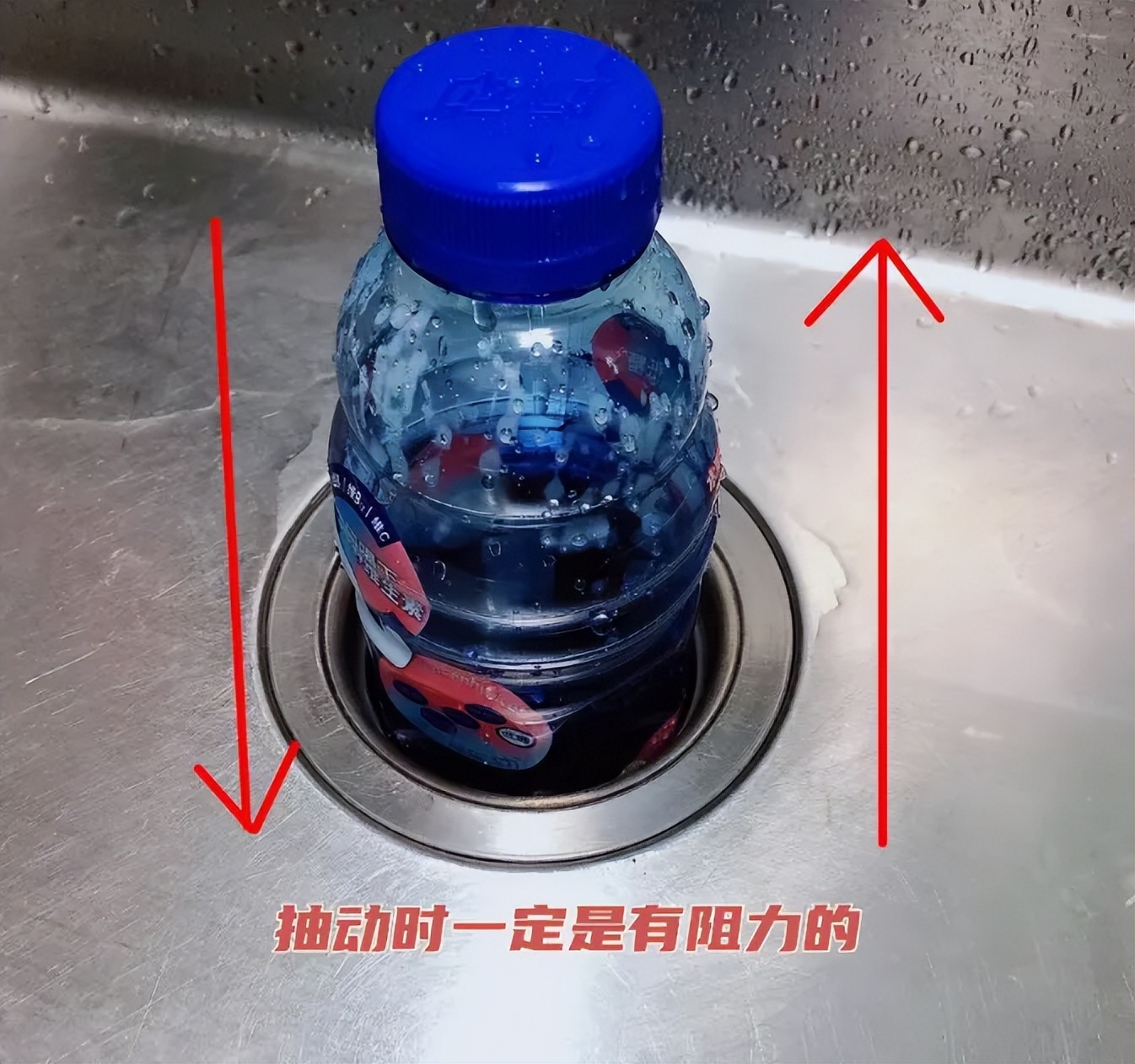如果家里的厨房下水管道不小心堵塞的话,大家可以先将脉动的瓶子剪掉底部之后,在下水管道的上方上下的抽动,将里面多余的水先排出去。