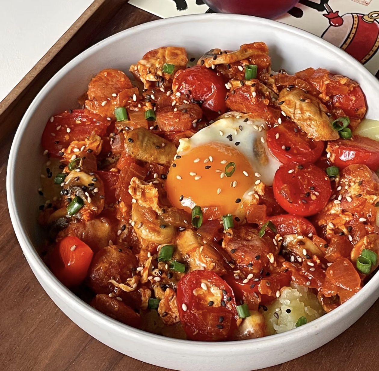 最后组装出锅,在铺好土豆泥的碗中,将熬好的北非蛋酱汁淋在上面,放上一片芝士,用勺子在酱汁中挖出两个小坑,打入可生食鸡蛋,盖上锅盖,小火焖煮5-6分钟,直到蛋清完全凝固,蛋黄保持流心状态。关火后,撒上少许葱花和黑芝麻点缀,一碗香气四溢的北非蛋土豆泥就完成了。