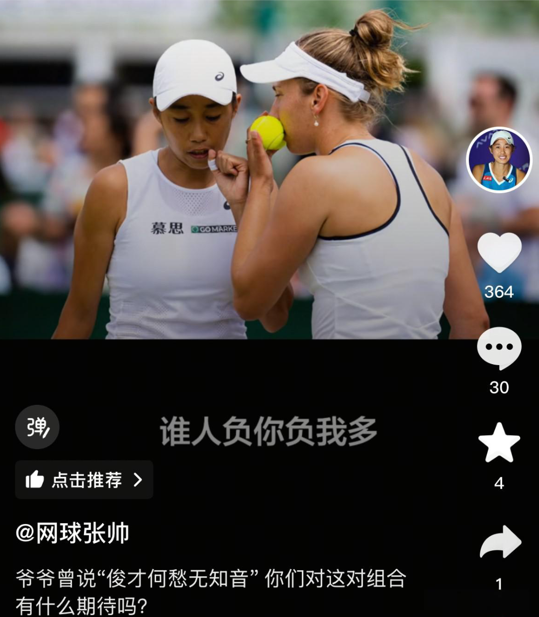 现在大家对张帅能搞定梅尔滕斯这样的人和自己出战明年澳网双打略显惊讶,还有另一个原因,像比利时名将这样的人在选择搭档时,都会选择和自己咖位差不多的人,这样打出好成绩的概率极大。