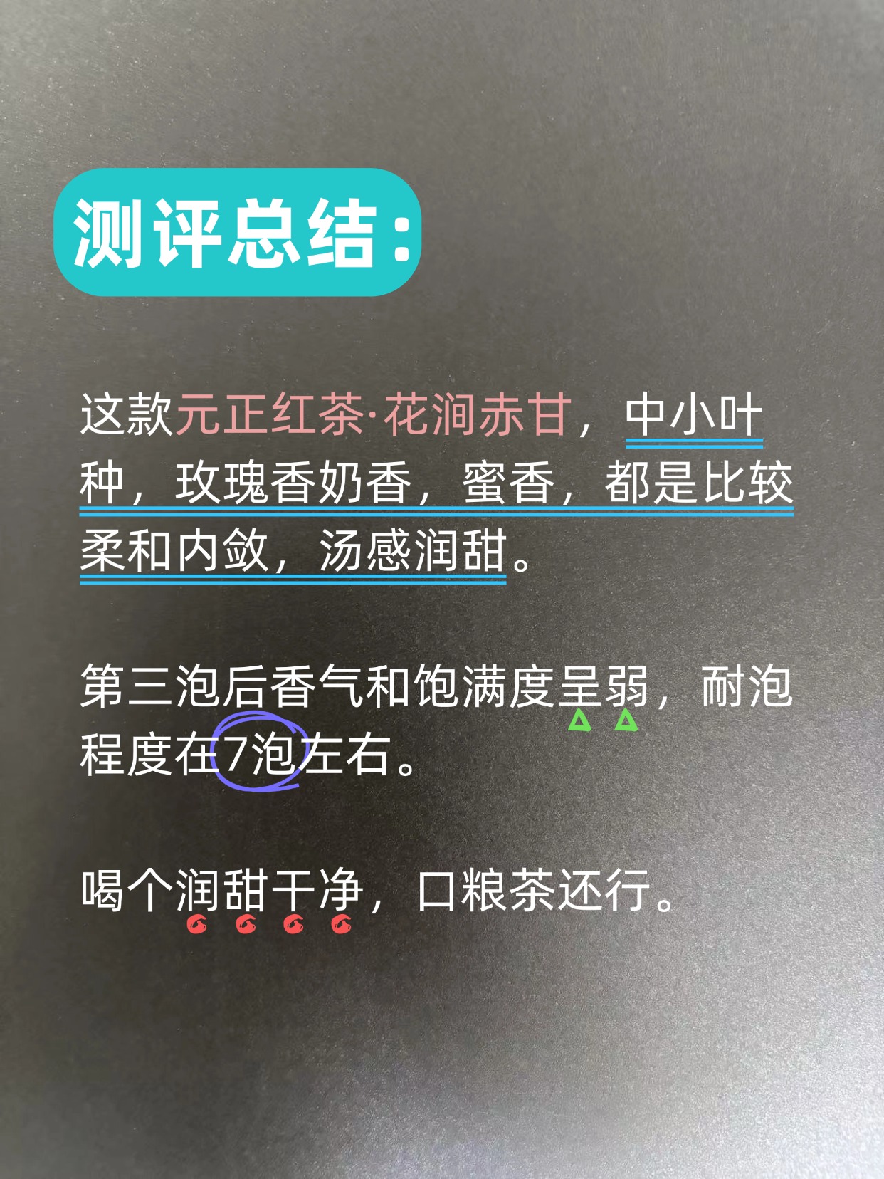 这款元正红茶·花涧赤甘,中小叶种,玫瑰香奶香,蜜香,都是比较柔和内敛,汤感润甜。第三泡后香气和饱满度呈弱,耐泡程度在7泡左右。喝个润甜干净,口粮茶还行。