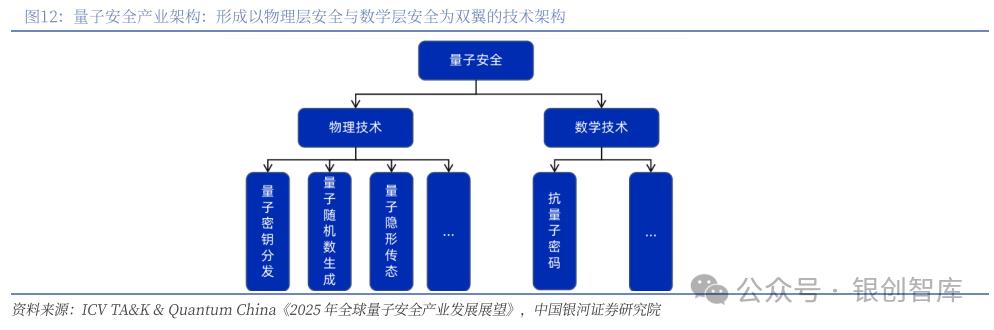 2 量子信息安全及产业链(一)推动网络跃升,筑牢量子防线量子安全是量子科技领域相对成熟、确定性较强的市场。量子安全作为应对量子计算威胁的核心防御体系,已形成以物理层安全与数字层安全为双翼的技术架构:物理路线即量子保密通信,其核心是密钥分发的安全;它利用量子不可分割、不可复制、测不准等物理特性,生成随机数作为密钥,并在分发过程中确保任何窃听行为都会因干扰量子态而被通信方案,从而在物理原理上保障了密钥传递的过程安全。与之互补,数字路线则以抗量子密码为核心,旨在设计并部署新型密码算法,使得即使在未来量子计算机的攻击下,其计算复杂度仍足以保障信息的长期安全。