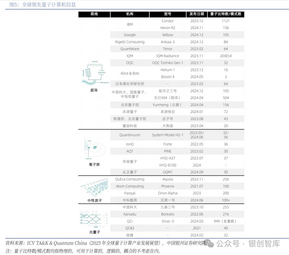 极低温环境:稀释制冷机(10mK 级)为超导路线核心,我国企业突破技术封锁,产品达国际主流水平,2024 年中国市场恢复至近制裁前规模,但面临大冷量提升、氦 - 3 进口依赖等挑战。控制系统:分固态(超导 / 半导体)与非固态(离子阱 / 中性原子)体系,核心难点是同步提升比特数与操控精度。核心组件:窄线宽激光器需高稳定性、低噪声,感光元件向高探测效率、低暗计数演进。量子芯片:与经典半导体工艺部分兼容(超导路线领先),融入纠错逻辑,EDA 工具链逐步完善;半导体量子点等路线受材料与加工精度限制,工程化滞后。中游(生态核心):集中了原型机制造商与软件供应商,超导路线为原型机主流(占比超 1/3),2024 年在门保真度、运算速度、比特扩展性上实现突破,产业化路径更明确。软件层形成全生命周期工具链:量子 EDA(芯片仿真)、测控系统软件(实时调控)、编译软件(指令转化)。国内外对比:欧美在企业数量、原型机制造、软件研发、开源社区上占优,我国政策完善,企业成长空间广阔。