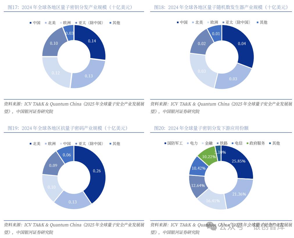 从量子安全各细分领域来看:根据ICV TA&K & Quantum China统计,产业规模方面,抗量子密码(POC)以6.56亿美元的规模领跑,其发展得益于美国NIST首批抗量子加密正式标准的发布,为行业提供了明确的技术规范与发展方向;量子密钥分发(QKD)作为物理层安全的代表,市场规模达5.09亿美元,技术成熟度较高,在国防、电力、金融等高安全需求领域已形成稳定应用;量子随机数发生器(QRNG)虽然规模相对较小,为1.16亿美元,但其与PQC的技术协同价值日益凸显,通过提供真随机数源显著增强了密码体系的安全基础。