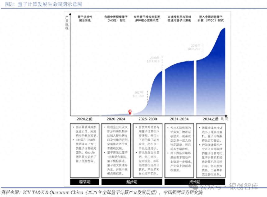 量子计算产业正迎来指数级增长窗口,根据ICV TASK & Quantum China预测,全球产业规模将从2024年的50.37亿美元攀升至2035年的8077.50亿美元,实现超过160倍的规模扩张。这一增长轨迹将呈现明显的阶段性特征:2027年专用量子计算机的性能突破推动产业规模突破百亿美元大关;2030年前后产业将进入加速期,规模有望达2199.78亿美元;而在2035年左右通用容错量子计算的实现,将引领产业进入真正意义上的爆发阶段。整体来看,前期依赖硬件性能突破奠定基础,中期通过专用领域应用打开市场,长期则依托通用计算能力实现全面产业化。