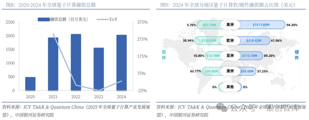 投资重点在2024年出现显著回调,重新由软件向硬件领域集中。这一转变主要源于两个关键因素:一方面,投资者认识到当前NISQ级量子处理器尚难以充分发挥现有量子算法的理论优势,硬件性能瓶颈已成为制约产业发展的主要矛盾;