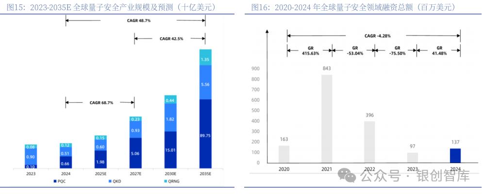 从融资环境看,2024年全球共有11家量子安全企业获得融资,总金额达1.37亿美元,且较2023年有所提升,但增速相对平缓。这一现象反映出资本对该领域仍保持审慎态度,行业规模较小与投资回报不确定性成为制约社会资本大规模流入的主要因素。量子安全产业发展将呈现明显的阶段性特征:2027年前为缓冲期,经典密码体系仍将维持相对安全;2035年左右随着经典密码面临实质性威胁,量子安全需求将迎来爆发式增长,ICV预计到2030年,产业规模将突破170亿美元,2024-2030年间年均复合增长率有望达到55.9%。