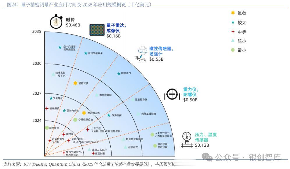 量子精密测量技术在下游应用领域广泛:在时频计量领域,原子钟凭借其卓越的频率稳定性,为卫星导航、金融结算及深空探测等关键基础设施提供高精度时间基准。量子成像与雷达技术则通过突破经典探测极限,在国防侦察、智能交通及环境监测等领域构建起新的技术范式。在生物医学领域,量子磁力传感器凭借其超高时空分辨率,为脑科学研究与神经疾病诊疗提供全新工具。量子电场测量技术则通过捕捉生物体微弱电信号,推动着新型医学诊断设备的发展。在资源勘探与基建监测领域,量子重力仪与陀螺仪凭借在动态环境下的稳定表现,为矿产探测、地下空间测绘等应用提供了革命性的解决方案。工业自动化领域同样受益显著,量子压力传感器与温度传感器在极端环境下的稳定性,正推动着高端制造、能源化工等行业的技术升级。