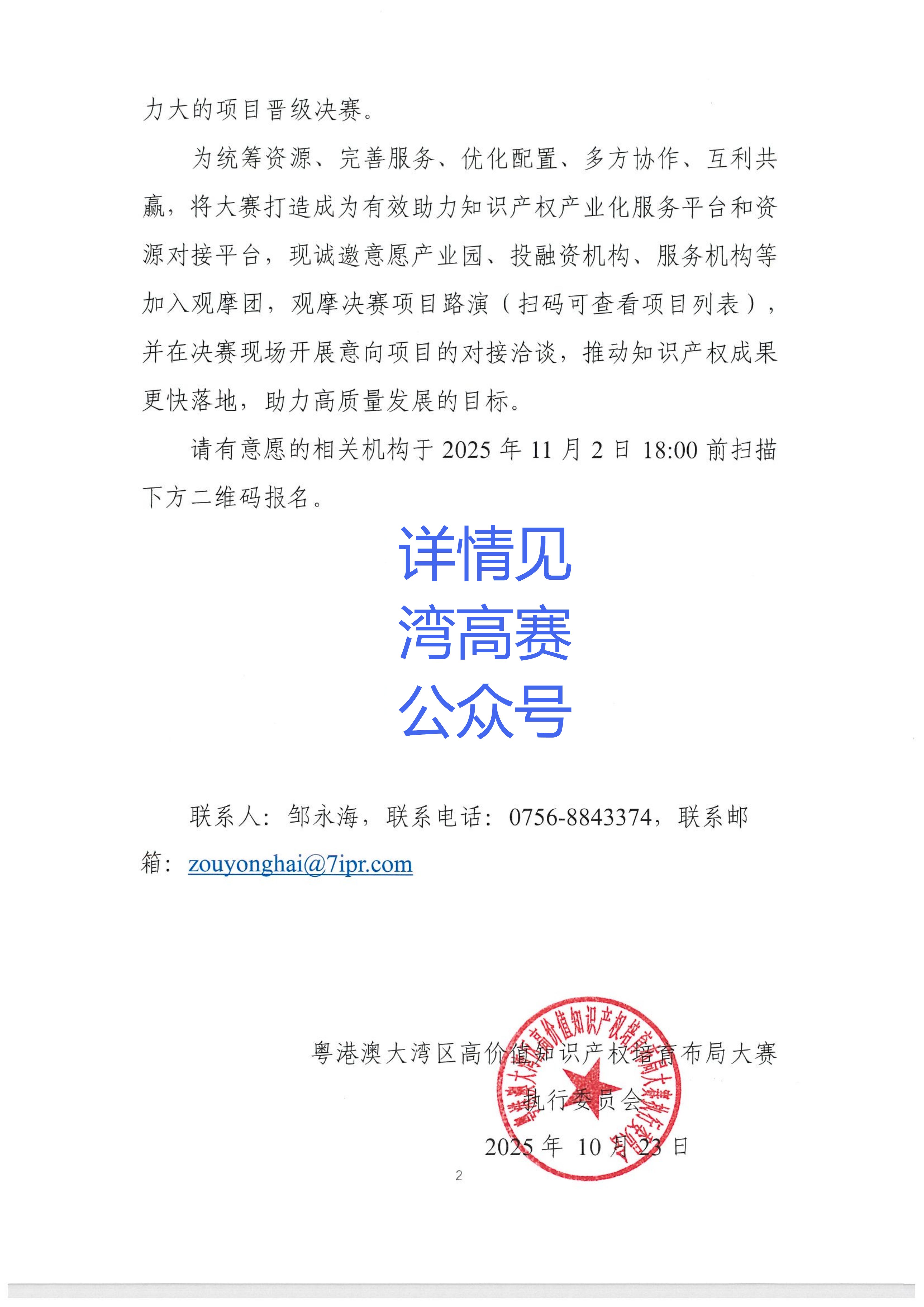 为充分发挥大赛平台作用,促进资源整合、服务优化与多方协同,推动知识产权高效转化与产业对接,现诚邀意愿产业园、投融资机构、专业服务机构等加入观摩团。参与观摩,即可高效对接300个晋级决赛的优质项目,与创新团队面对面深入洽谈;既是投融资机构精准发掘前沿项目、布局新兴赛道的直通窗口,也是产业园区高效集聚创新要素、构建产业生态、推动项目落地的良好机会。通过现场观摩路演(项目详情请见附件二维码)和对接交流,各方可共同推动高价值知识产权成果加速转化落地,服务大湾区现代化产业体系建设。
