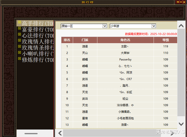 整整甩开【少年游】等级第二名9级,甩开原始服其他三个服务器等级榜首10级!