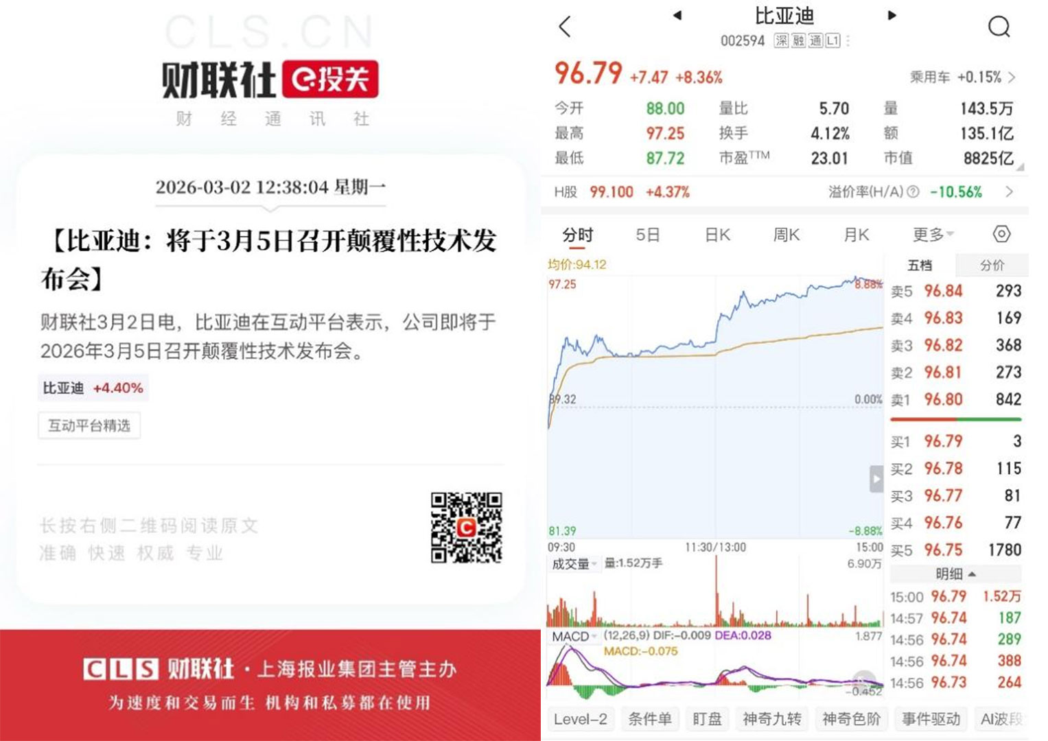技术创新层面同样传来积极信号。3月2日,比亚迪通过投资者互动平台宣布,将于3月5日举办一场“颠覆性技术发布会”。该消息一出,资本市场反应热烈,公司A股股价当日飙升8.36%。这一市场表现充分反映出投资者对其核心技术实力的高度认可与坚定信心。
