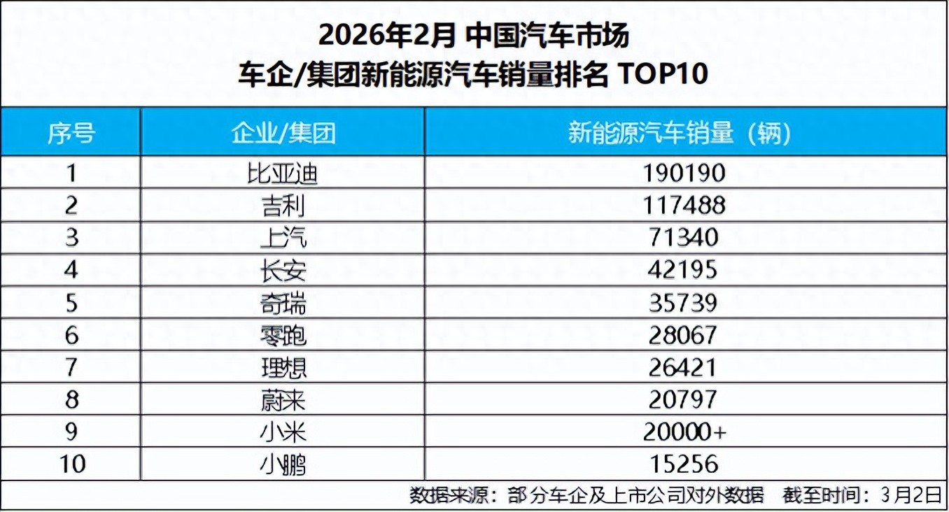 2026年伊始,中国新能源汽车市场的竞争版图愈发清晰。 最新披露的产销数据显示,比亚迪集团2月份新能源汽车销量达到190,190辆,再度蝉联行业冠军,在主流车企阵营中持续展现出显著的领跑优势,以稳健而强劲的市场表现进一步夯实其头部地位。