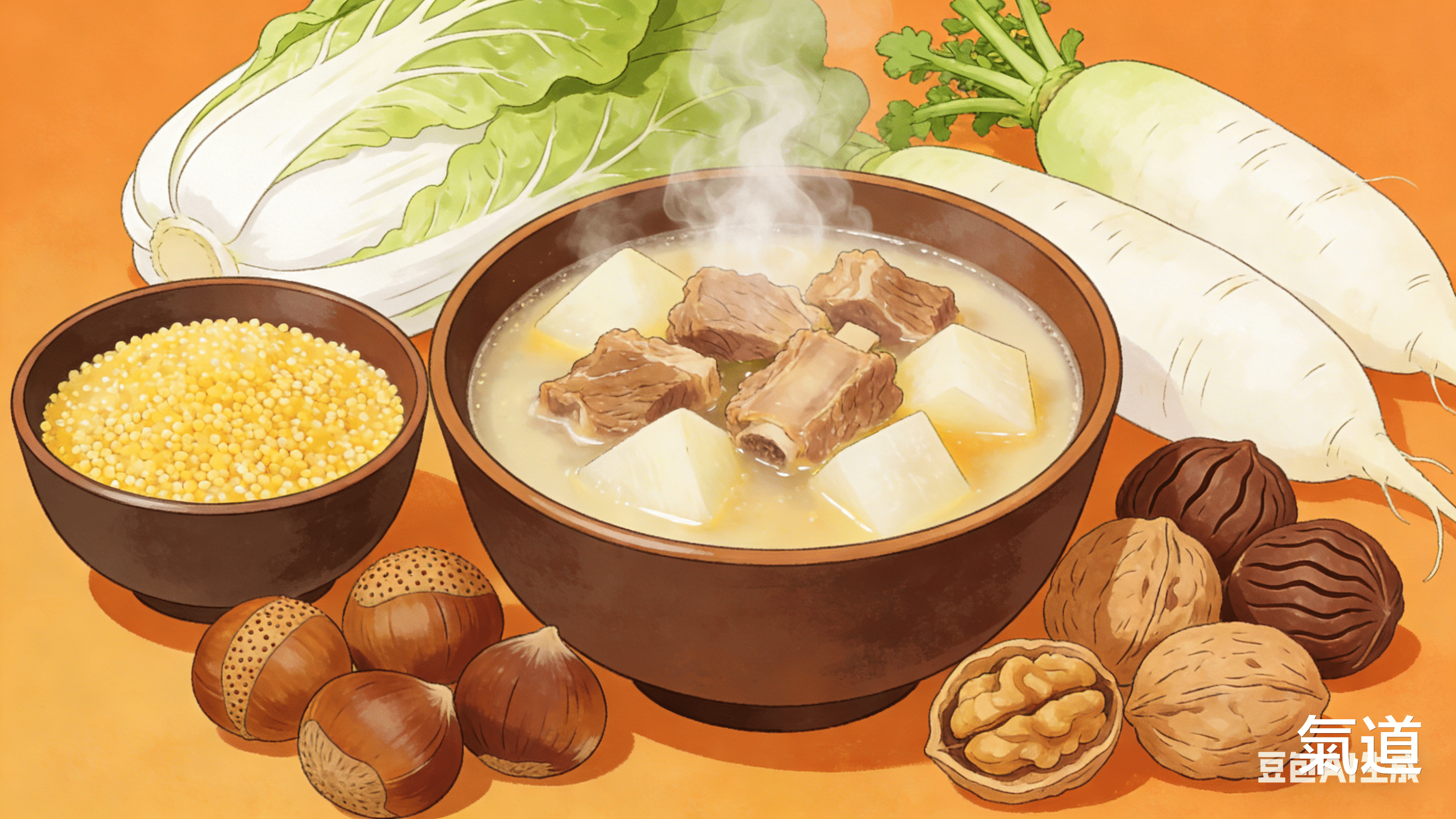 可适量吃羊肉、牛肉、鸡肉等温热性食材(每天畜禽肉总量控制在40-75克,避免过量摄入饱和脂肪酸),搭配萝卜、白菜等清热润燥的蔬菜,补气血的同时还能避免上火。早餐喝碗生姜红糖水或杂粮粥(小米粥建议搭配杂豆,别煮太烂,控糖人群需控制量),暖身又暖胃;晚餐适量吃点栗子、核桃,既能补能量,还能滋养肝肾。