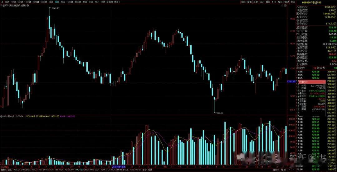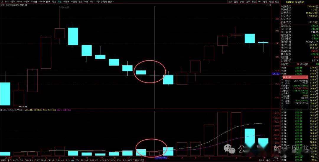 接着我们来看指数,图4为科创100指数周线图,图5为科创100指数月线图。图中可见小k线成组,收盘价接近,以及突然出现的量价双缩。