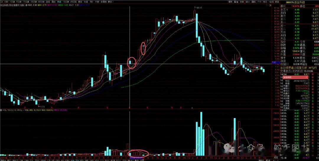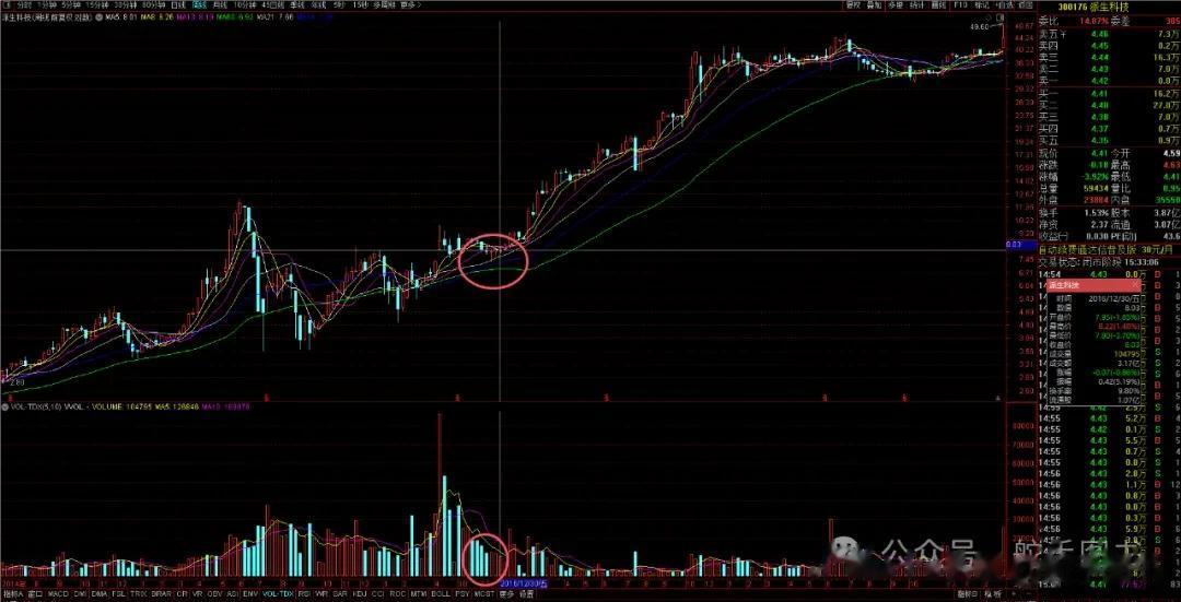 2015年股灾后的大牛股,鸿特精密(300176)月线现在改名叫派生科技,如图2,连续两次出现关键价位的突然大幅度月线级别缩倍量并且平量,价格保持一致,小k线,第一个红圈对巨量的异动位进行确认,第二个红圈对2015年牛市的高点进行确认。股价从8元附近一路涨到40元才减速,最高达到了60元。