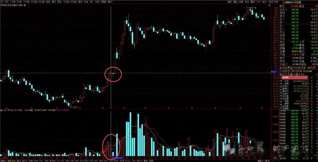 不同年代的10倍牛股,图1为同花顺(300033)月线,红圈处为2014年9—10月(大牛市)的经典一刻,逆势的量价异动后出现向上的洗盘,随着主力的力和多空双方争夺的力两个融合,市场到达了一个关键价位——历史高点,同花顺在这么一个重要的位置出现了异常清晰的量价双缩,并且还是连续两个月,9月成交量比8月少接近一半,10月成交量比9月少了一半还多,两个月的大幅迅速缩量后价格还保持一致。前面说过,这种阶段任何一方稍稍一用力,股价便会发生新的反转。如果是在关键价位出现,则更加面临反转。同花顺毫无疑问地成为了当时证券行业的第一牛股,从9月的90元上涨到了1141元(后复权),涨幅超过1100%。