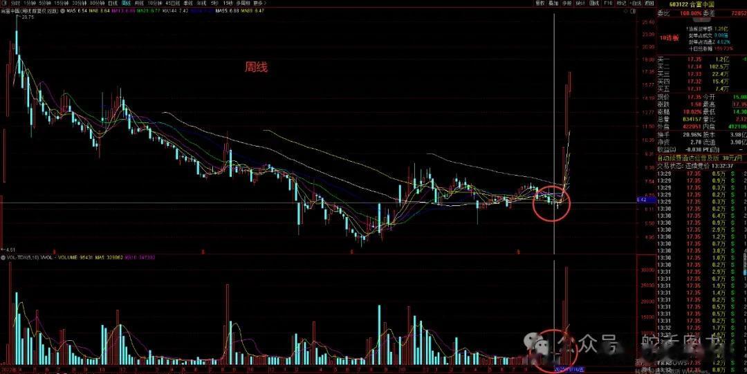 我们再细看一下,图3是该股当时的周线,是不是一模一样?你叫周期共振也好,趋势共振也行,总之这是重大趋势转折的关键价位,从市场行为的角度说想买进的早已买进持股并坚定看涨(缩倍量价格不变),看空的也在大部分的争夺中卖出了,这一刻市场启动的心理时刻来临了。股价一旦反转,上升是几乎必然的选择。你只要有一些钱,此刻你就能像我一样推动市场。