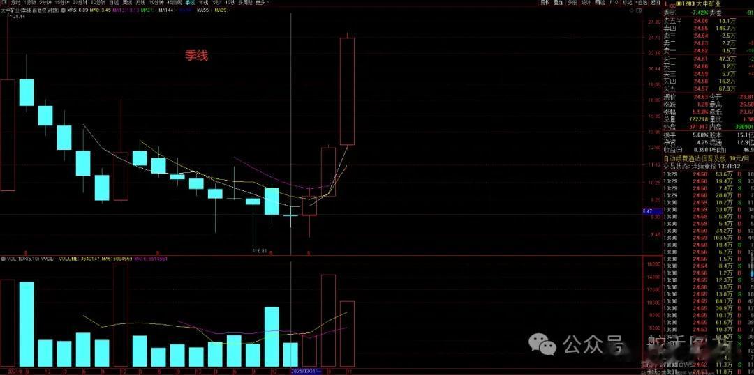2003年我在老一辈的影响下开始真正进入操盘,虽然懵懂,但其实早已有多年阅读行情的经历和能力了,那段股市的牛熊过往也让我各方面收益颇丰。如图7,上证指数季线图图中红圈处,上证指数的季k线在其调整到998后探底回升,于2005年10—12月的季线出现了小k线(图中红圈),指数收盘价几乎一致,缩倍量。随后市场进入了为期两年的特大牛市。