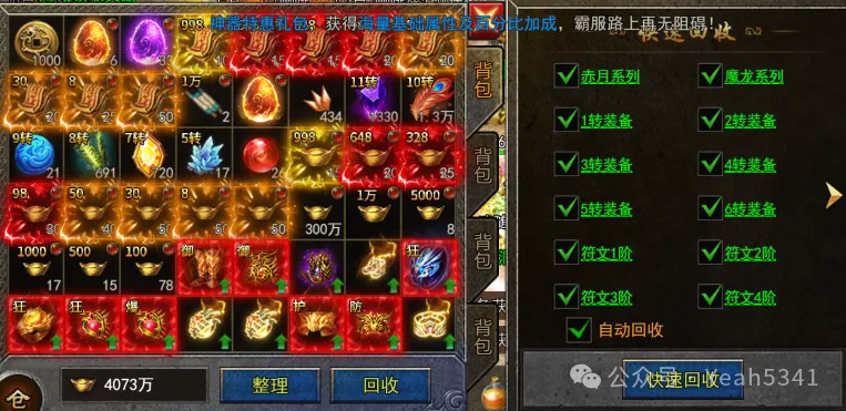 装备系统:通过副本掉落、合成获取装备,高阶装备可通过 “龙生九子” 套装、兽神装备强化属性。多余装备可熔炼为材料,女性角色可将男性装备转化为强化素材,建议开启自动熔炼节省空间。