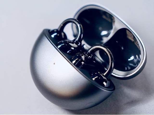 佩戴设计特别贴心,耳机用了2.5mm 的错位设计,戴在耳朵上是前高后低的样子,特别贴合耳朵形状,戴着特别稳;还有∠ 12° 的弧面耳托,把耳机电池那块做成了弧形,能贴紧耳背,舒适度又上了一个台阶;单个耳机才4.5 克,就算戴好久,耳朵也没啥负担,完全不会有压迫感。