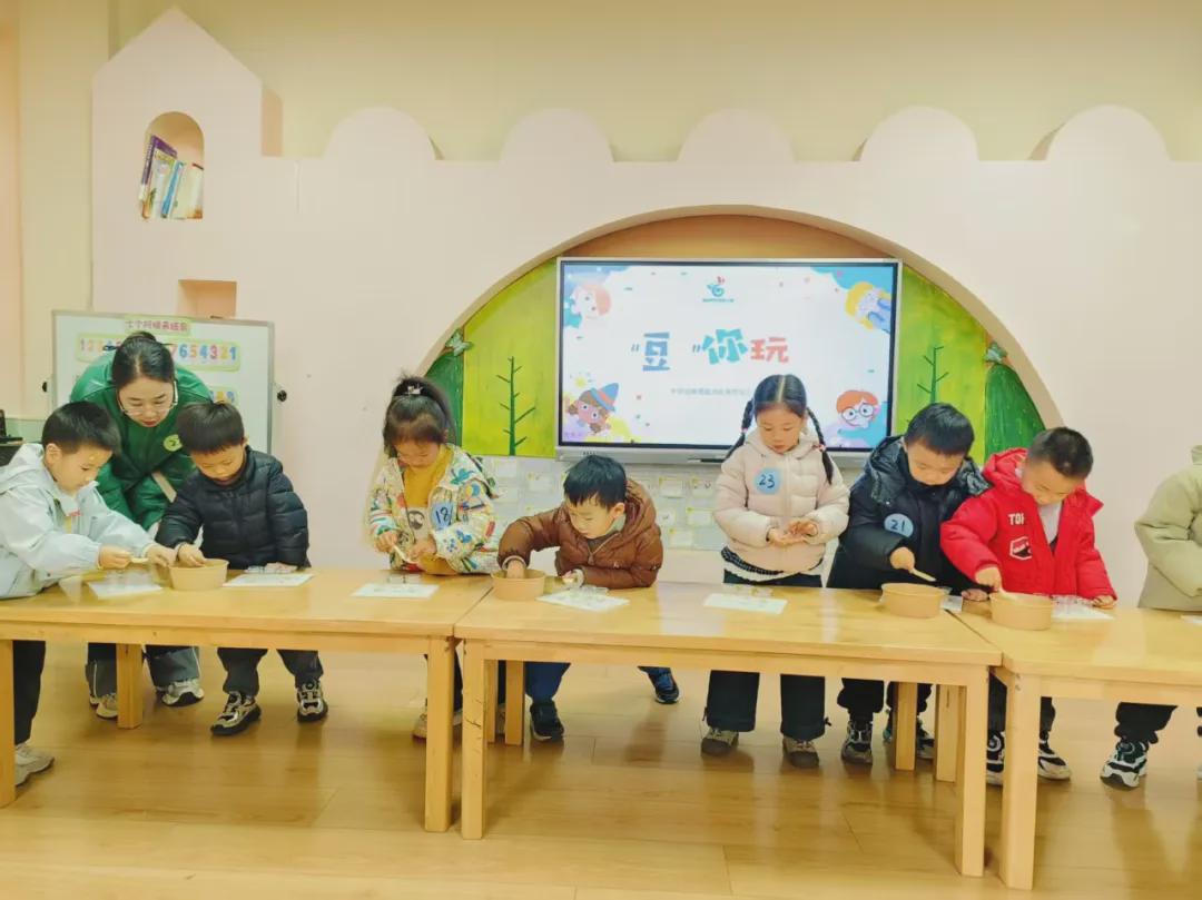 “豆” 你玩挑战中,宝贝们手持小勺,小心翼翼地将黄豆按对应数量分到碗中,专注耐心地完成任务。