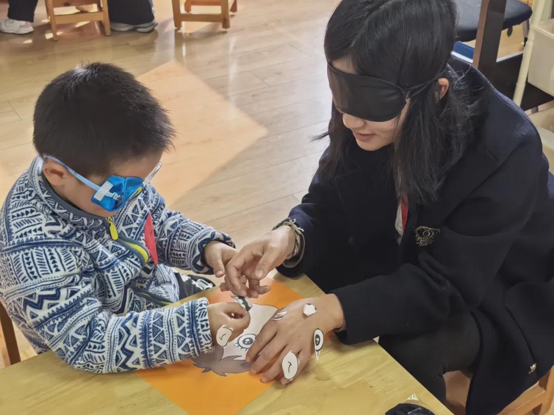 “你剪我贴” 环节,萌娃们熟练使用安全剪刀剪出五官剪纸,家长们戴上眼罩在宝贝引导下粘贴,亲子默契互动充满趣味,创意满满的作品定格下温馨瞬间。