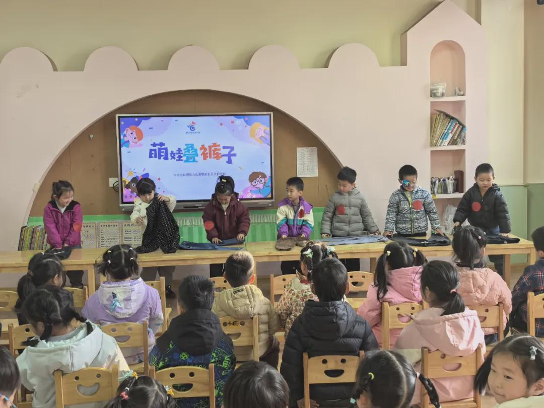 “萌娃叠裤子” 环节,孩子们循着老师教的方法,平铺、对折、整理边角,将裤子叠得方方正正,每一步都充满认真与坚持。