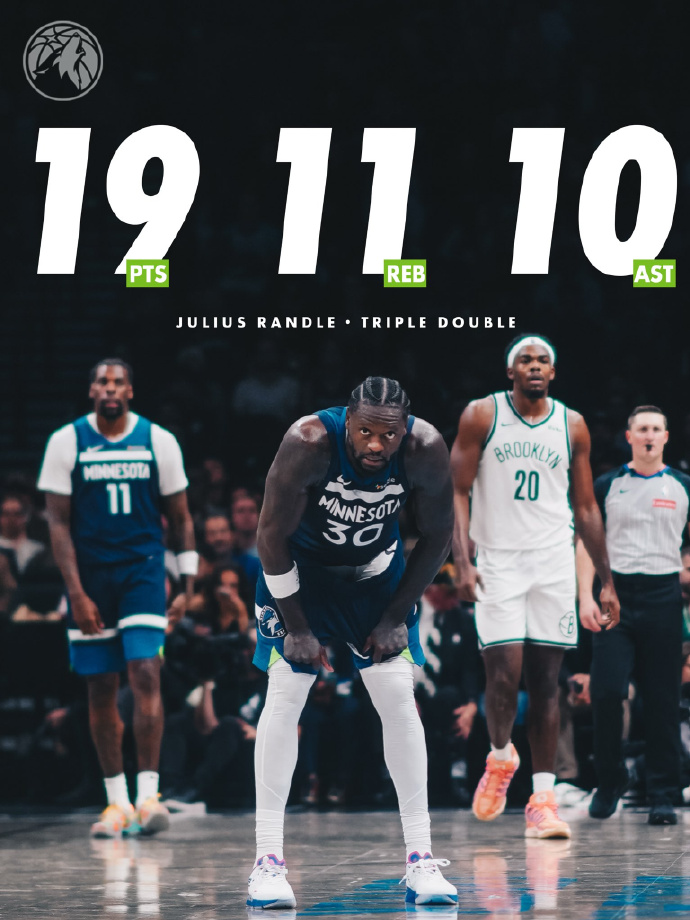 值得一提的是,这是兰德尔森林狼生涯首次拿到三双。在爱德华兹遭遇伤病的情况下,兰德尔成为球队领袖,赛季至今出战7场比赛,场均可以得到26分7.1篮板5.7助攻1.3抢断,投篮命中率55.8%,三分球命中率43.2%,罚球命中率83.3%。