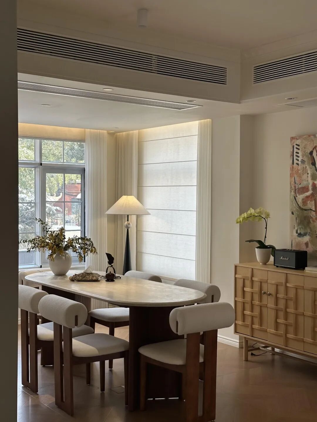 很多人觉得餐桌“买大不买小”,那种超长餐桌,摆在家里,搭配软装,高级感拉满。
