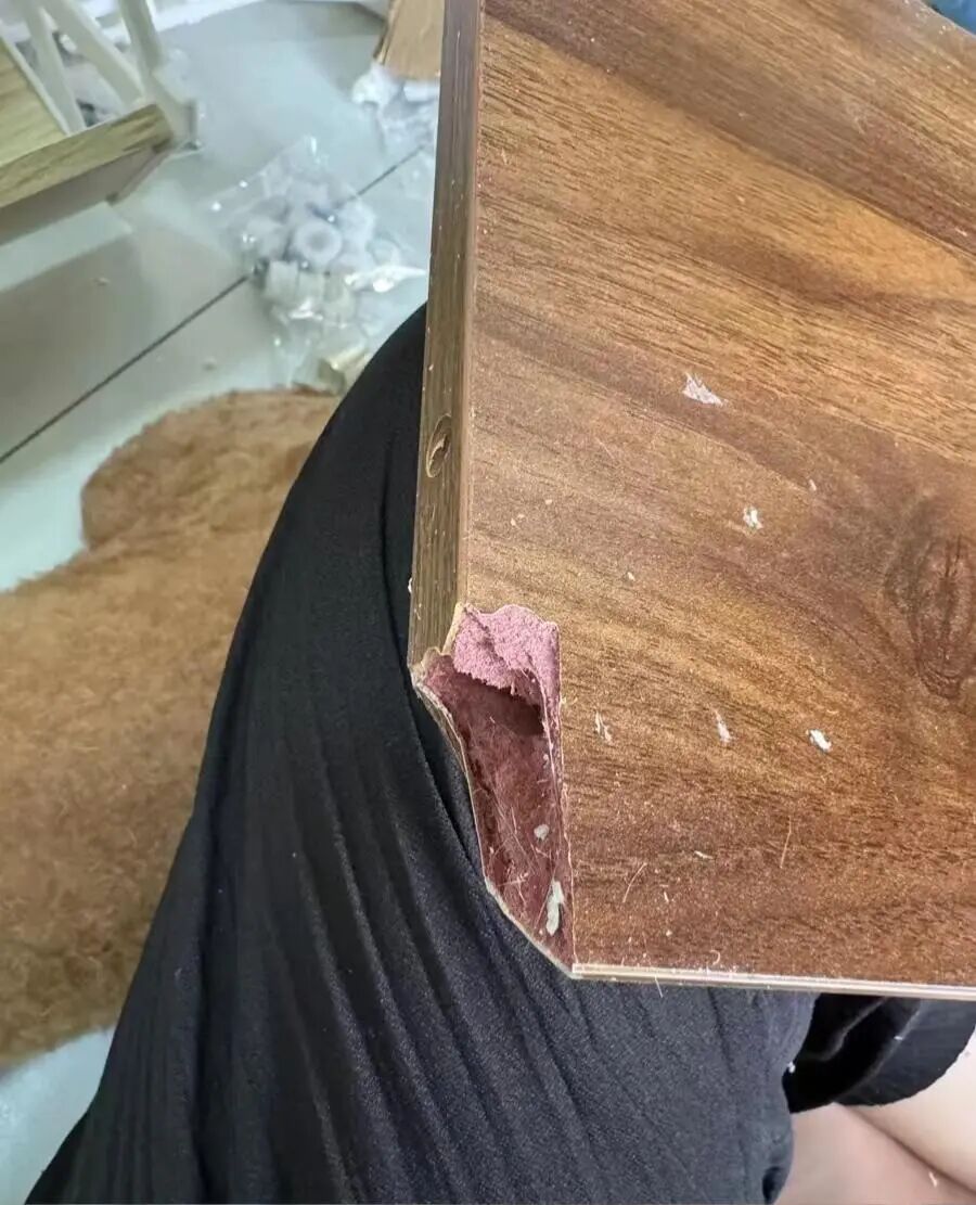 老师傅说,假实木餐桌,表面只是贴了一层实木皮,内部全是劣质的合成板材,里面全是胶水,甲醛含量严重超标,放在家里,就是个隐形杀手。