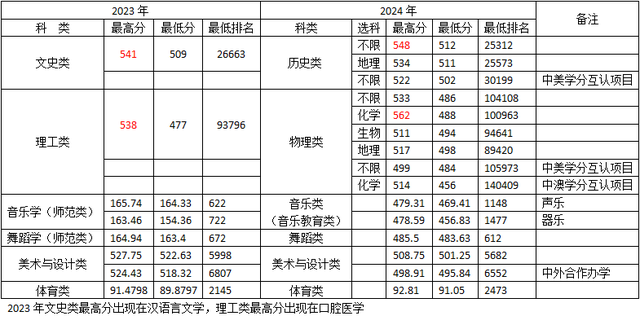 2023年,九江学院理工类投档最高分是538分,出现在口腔医学专业,高出一本线20分,2024年物理类投档最高分是562分。