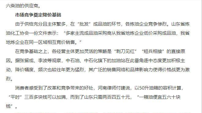 要知道山东大部分的民营加油站,本身就是就近选择炼油厂,购买后直接运输到加油站,运输环节和人工费用大大降低了油价。然而当山东炼油产能过剩时,山东省炼油化工协会文件表示,本省地炼企业在同一区域相互竞价销售,这样的销售模式也让山东油价一降再降。