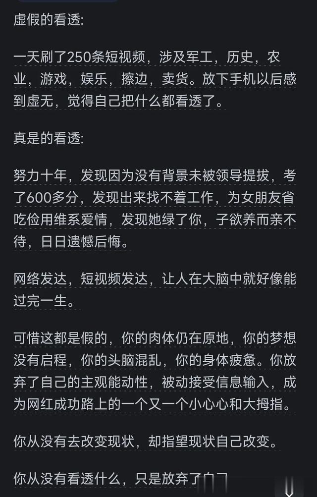 他们这么干,还不是为了流量嘛,让你觉得“学到了”“比别人懂”,你一爽就愿意关注、点赞,他们就有好处。可真要琢磨透事儿,哪能靠这几句现成的?得自己去想、去试,光听别人嚼碎了喂的,顶多算浮在表面。