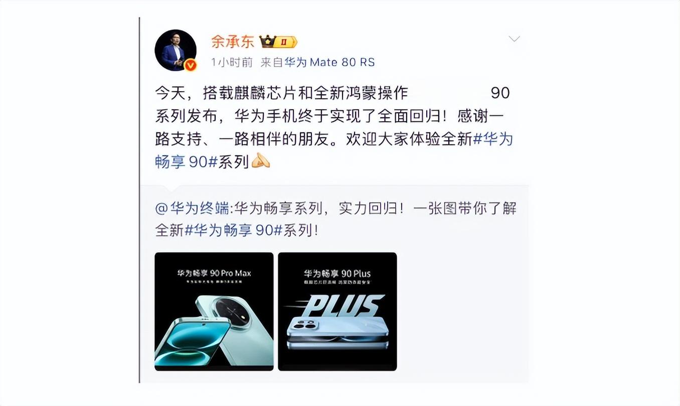 “2023年Mate 60先锋计划,我们实现了中高端机回归;今天,畅享90系列的推出,标志着华为手机全面回归!”发布会上,华为终端BG首席执行官何刚的一句话,瞬间点燃全场。