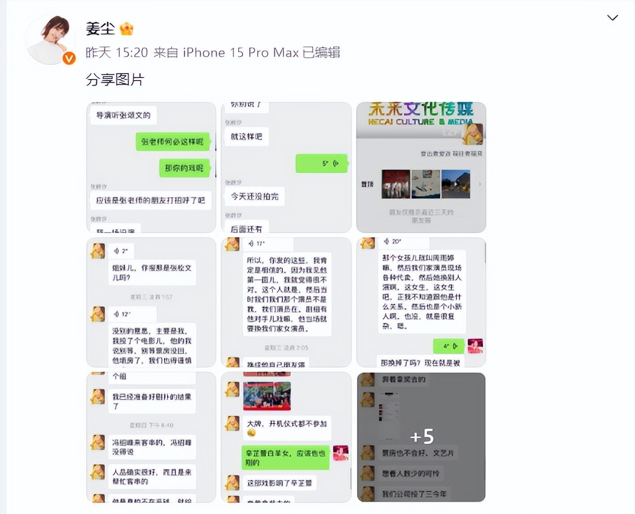 更戏剧性的是,姜尘姑娘又爆出了和禾采文化某人的聊天记录,说张颂文老师耍大牌,换演员,等等。 这猛料一出,大家再次沸腾!