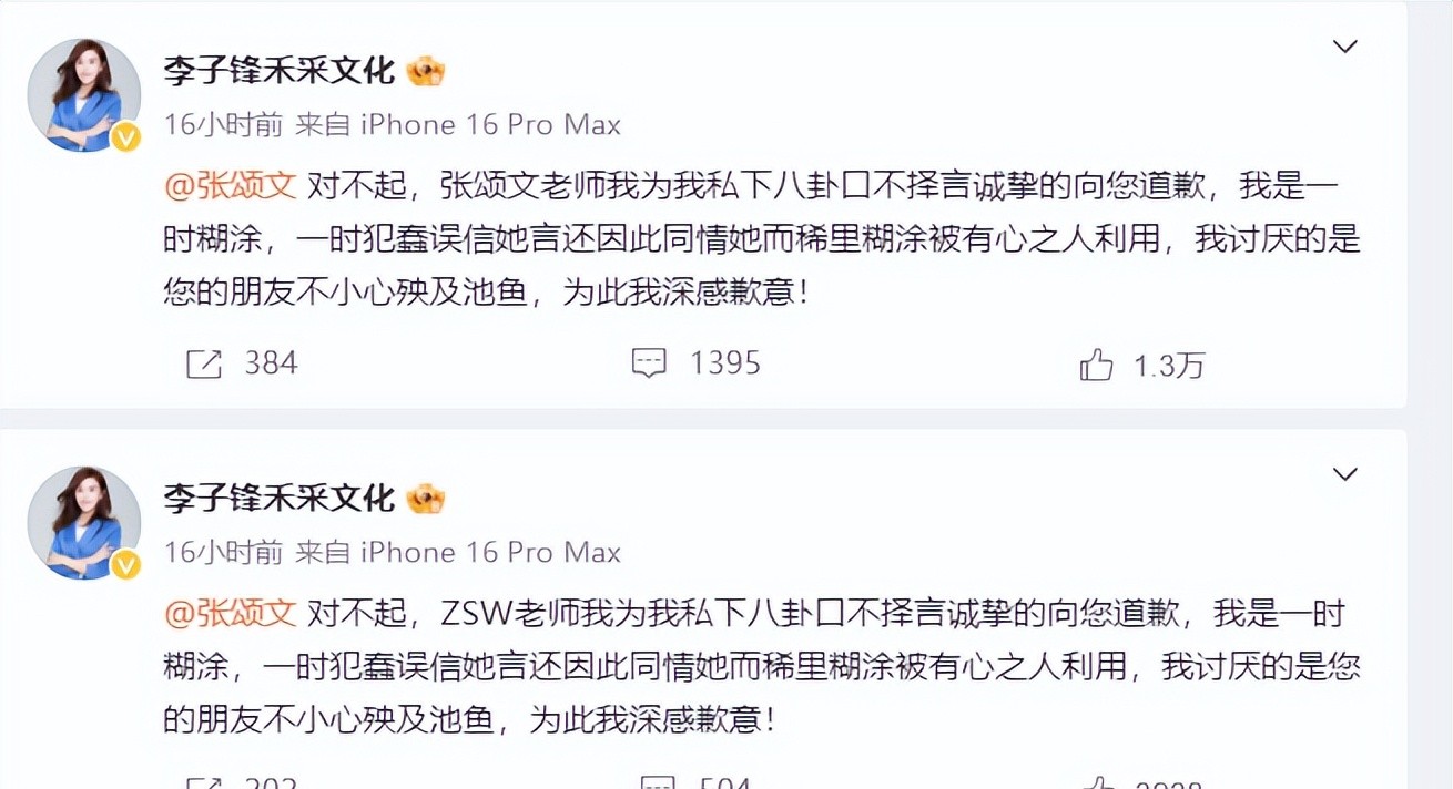 但,剧情反转了!这位禾采文化的李子锋出来道歉了,说聊天记录被恶意剪辑了,爆料的人不是张颂文老师,是自己朋友,还说自己一时八卦,被姜尘姑娘利用了!他还说姜尘姑娘在美国,经常贬低咱们国家……