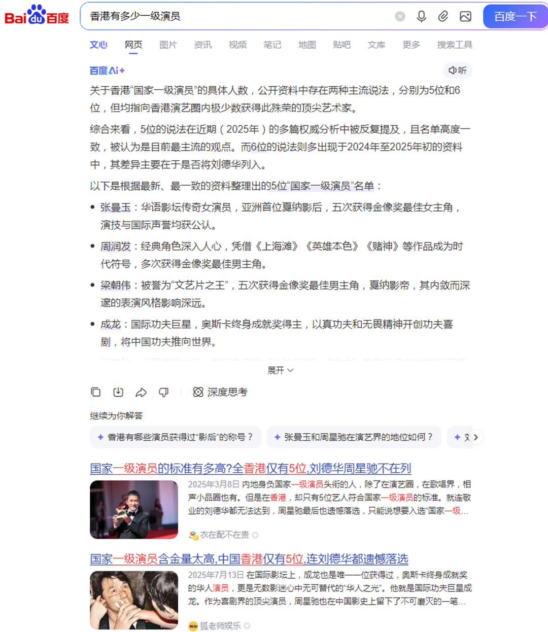 在网上搜索出来的香港一级演员,保底是5个,分别是张曼玉、梁朝伟、成龙、周润发和王菲;有出入的名单,则包括刘德华和周星驰,基本上都是香港娱乐圈最顶级的超级巨星。