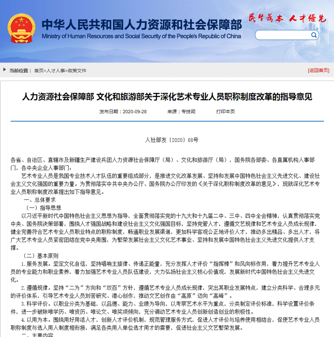 《意见》中指出:建立职称评审绿色通道。建立职称评审向优秀人才倾斜机制,在践行社会主义核心价值观、推动中华优秀传统文化的创造性转化和创新性发展、促进文化艺术事业繁荣发展中作出重大贡献的艺术专业人员,放宽学历、年限要求,可直接申报评审高级职称。