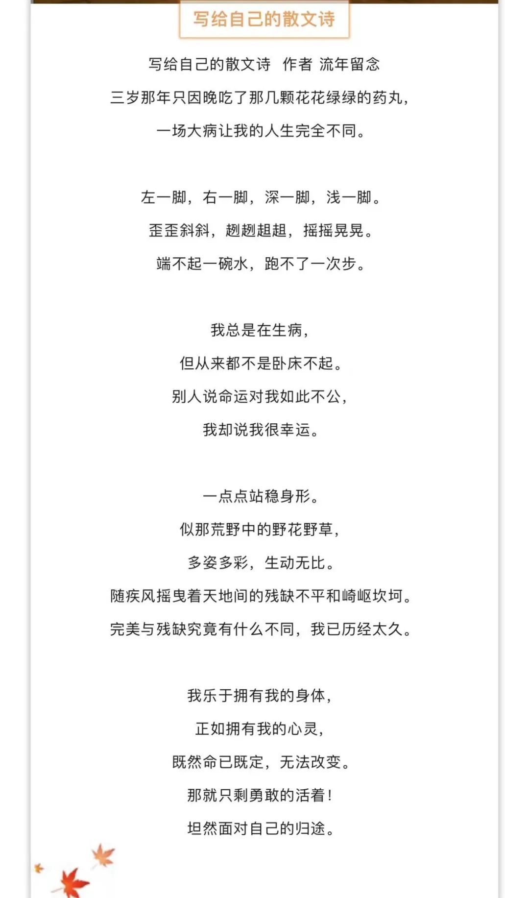 在那些缓缓流淌出的文字中,他写左腿肌肉萎缩导致冬天生冻疮,也写妈妈给他做的厚棉裤;他写了被同学嘲笑的苦闷,也写了杨老师带给他的感动。
