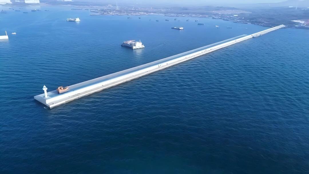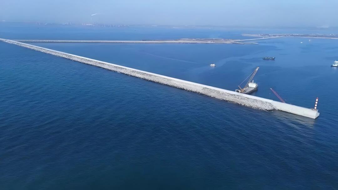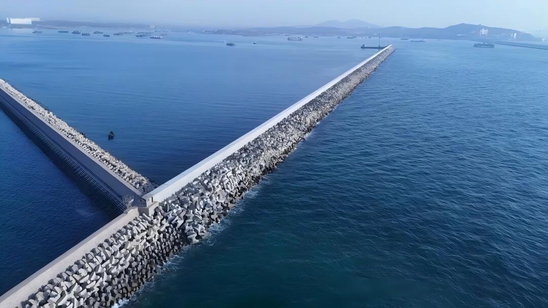 工程采用东、西防波堤“双堤环抱”总体布局,总长度达2601米,其中东防波堤长1343米,西防波堤长1258米,两条堤坝为胡家山作业区构筑起可靠的安全屏障,有效保障船舶停靠、货物装卸及后续码头施工安全。
