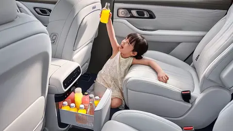 第二排独立座椅带通风、加热和按摩功能,第二排还有个9.1升的冷暖冰箱,夏天能冰冷饮,冬天给孩子存温奶,细节做得很贴心。