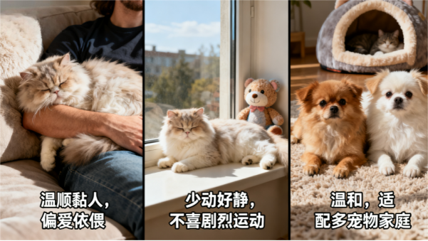 行为特征:少动好静,不喜剧烈运动,更偏爱在阳光充足的窗台或柔软沙发上蜷卧休息;好奇心温和,对新玩具会缓慢探索,不会像短毛猫那样活泼好动;夏季因被毛浓密,不喜被人抱在怀中,更爱独自躺卧在凉爽地板上降温。