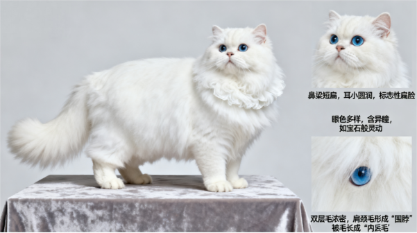 眼部:双眼大而圆,间距宽且突出,宛如两颗晶莹的宝石,眼色丰富多样,包括蓝色、绿色、金黄色、铜色等,部分双色毛个体可能出现异瞳,眼神温柔灵动,与扁脸搭配更显娇憨。