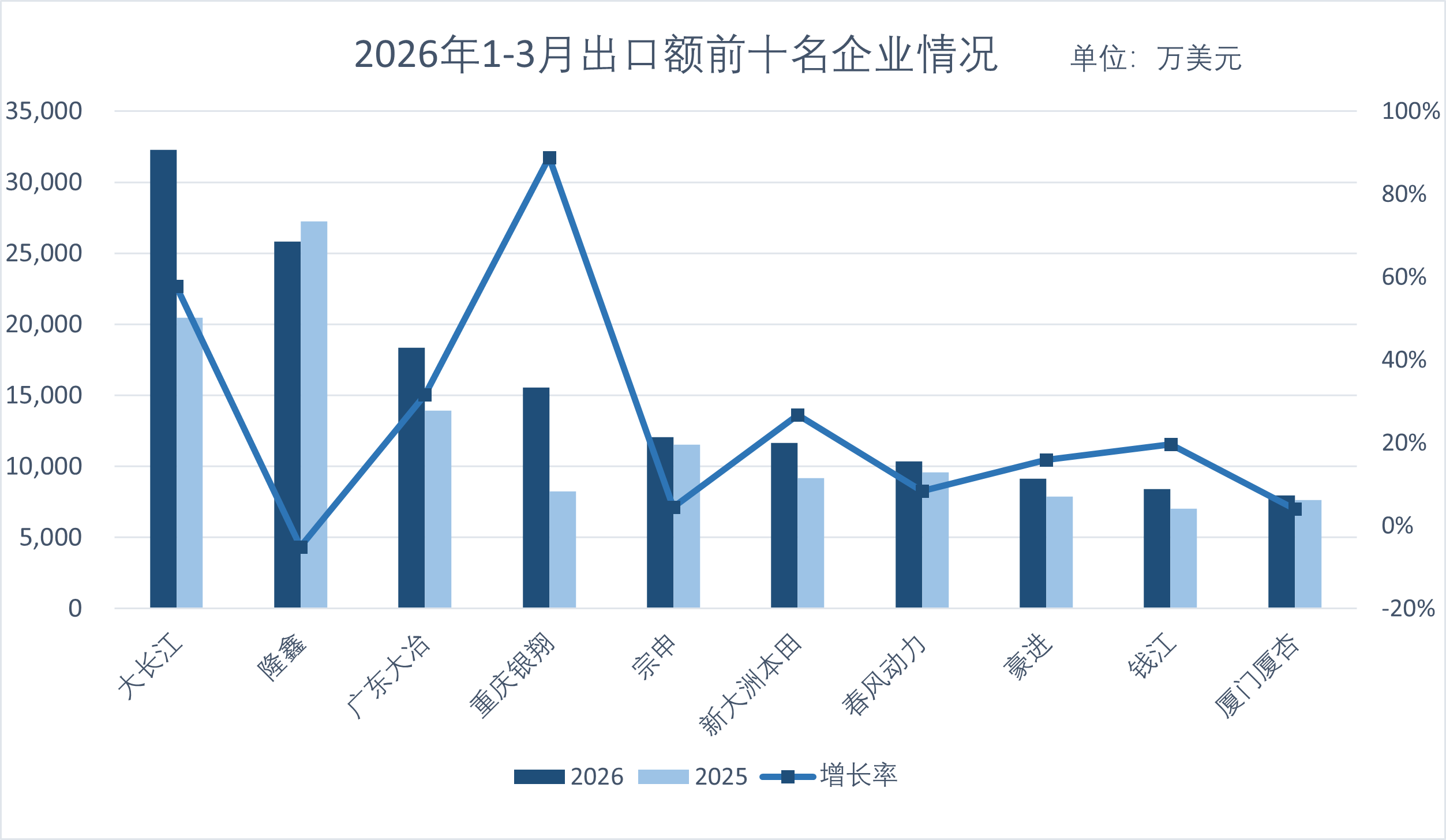 从出口金额看,江门市大长江集团有限公司位居榜首,重庆隆鑫机车有限公司、广东大冶摩托车技术有限公司紧随其后。重庆银翔摩托车集团有限公司以超过80%的同比增速成为增长最快的企业。十强企业出口金额合计15.15亿美元,占摩托车出口总额的65.16%。